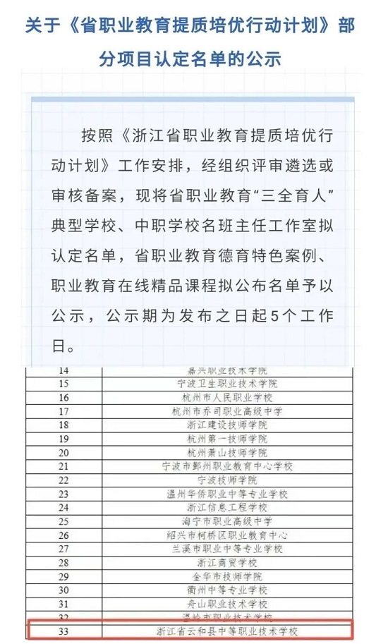 近日,《浙江省職業(yè)教育提質(zhì)培優(yōu)行動計劃》認定名單公示,云和縣中等職業(yè)技術(shù)學(xué)校榮獲浙江省職業(yè)教育“三全育人”典型學(xué)校。此次共遴選中等職業(yè)學(xué)校“三全育人”典型學(xué)校33個。