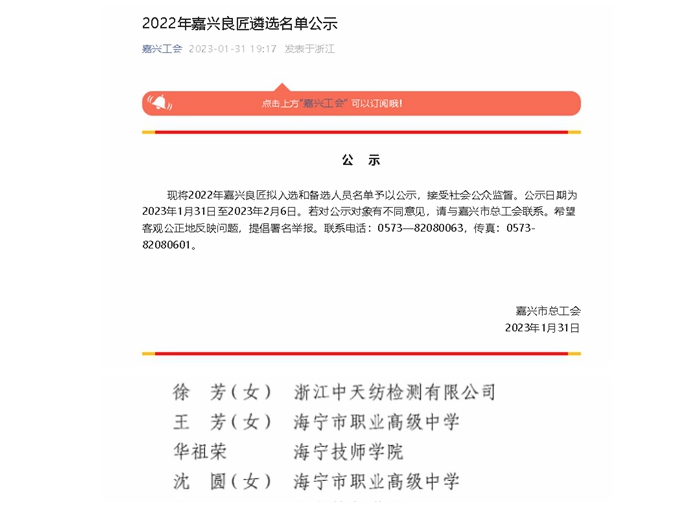 日前,由嘉興市總工會(huì)公布的2022年嘉興良匠擬入選和備選人員名單公示期結(jié)束。海寧市職業(yè)高級(jí)中學(xué)王芳、沈圓兩位教師成功入選。