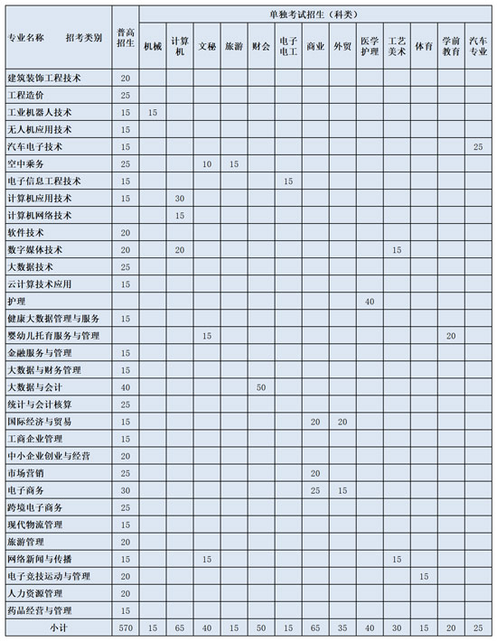 第八條 招生專業、科類及計劃。招生專業32個,招生計劃1000名。其中面向普高招生考生計劃570名,面向單獨考試招生考生計劃430名,學制均為三年,具體專業計劃如下表: