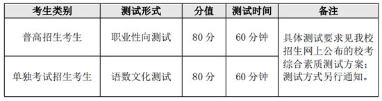 校考綜合素質測試實行分類命題、分類評價。各專業普高招生考生進行職業性向測試,重點考核職業適應性;單獨考試招生考生進行語數文化測試,重點考核文化素質。測試成績四舍五入保留兩位小數。具體測試規則如下:
