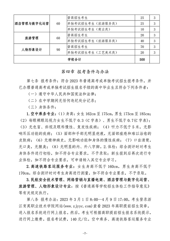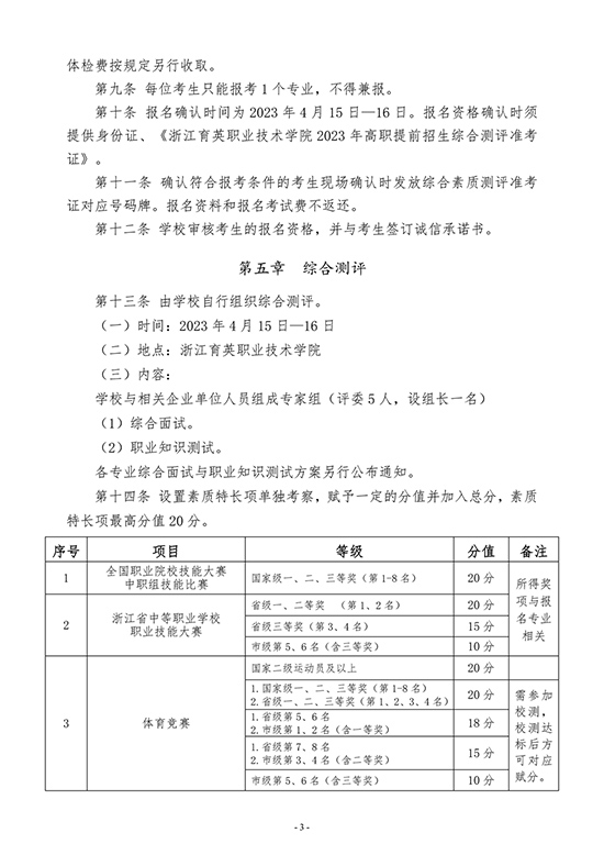 浙江育英職業技術學院2023年高職提前招生章程