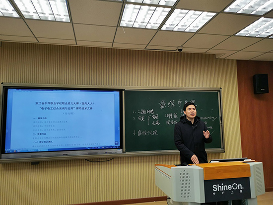 下午,長興職教中心副校長霍永紅向大家詳細解讀了浙江省中職學校面向人人“電子電工綜合裝調與應用”的賽項技術文件。