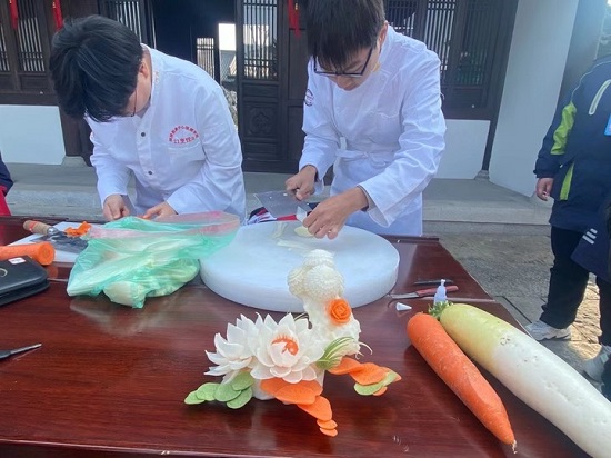 學校優秀“陽光使者”們在校團委的帶領下,深入齊賢光明居,開展烹飪雕刻、衛生清掃、現場繪制帆布袋等志愿服務活動。烹飪專業的學生拿起刻刀,鋒利的刀刃游走于蘿卜之上,不一會兒,一朵朵優雅高潔的蘿卜花便呈現在路人面前;美術專業的學生們當場為路人在帆布袋上作畫,通過贈送的形式將這份美好傳遞給大家;其他學生則將光明居廣場進行了徹底清掃,雖然石板地歷經滄桑,各種凹陷和縫隙加大了清掃難度,但是,同學們干勁十足,勞動場面熱火朝天,在大家的共同努力下,石板地煥然一新。