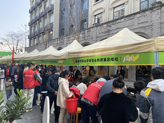 活動地點,該校設有4個志愿攤位,由四個專業部分別開展親子剪紙、科普、懸灸、愛心義賣志愿服務。