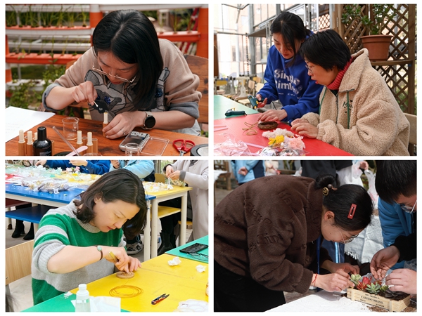 學校校工會、婦代會的志愿者老師們早早準備好場地和素材,女教職工們可以根據自己的喜好任意選擇車載掛件、潤唇膏、多肉植物組合微景觀或者掐絲琺瑯畫制作。在綠色掩映之下,不時傳來陣陣歡笑聲。