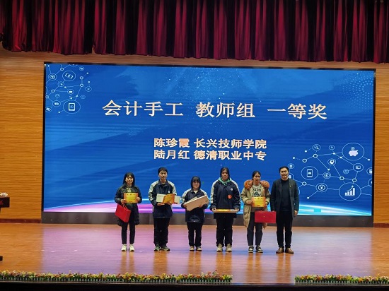 賽后進行了簡短的閉幕式。湖州市職成教研究中心財經商貿教研員謝佳芳宣讀了各賽項一等獎的師生名單,長興技師學院阮強志院長等為獲獎的師生進行了頒獎儀式。