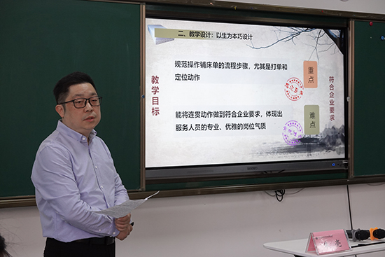 華僑職業中專學校朱亮老師帶來了《雙師共導,巧練能手—客房中式鋪床實訓之甩單定位》的說課展示。朱老師緊扣“產教融合”理念、立足課堂實效、對接崗位要求,實現雙師共導優勢互補的課堂教學。