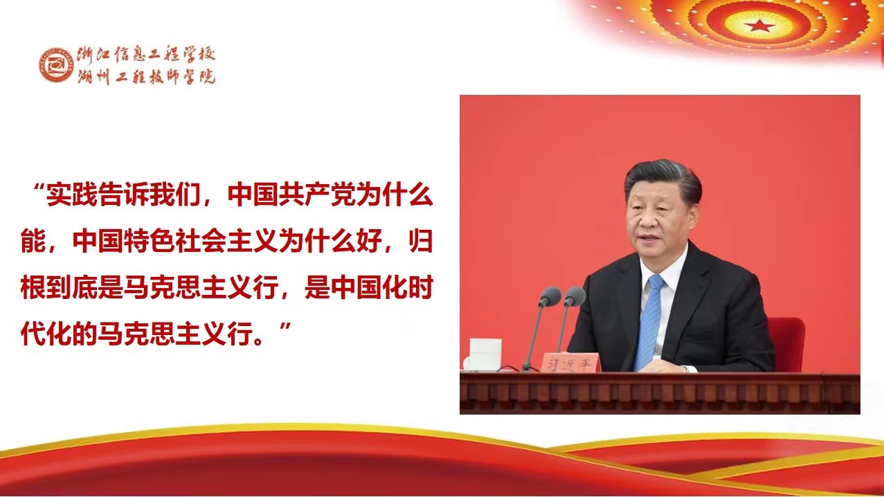 3月13日,浙江信息工程學校·湖州工程技師學院舉辦的“全校師生同上一堂思政課”如期舉行,信息黨支部書記胡煜帶領黨員教師陳曉宇、周鳳、余姝妮、姚毅芬一起以題為《馬克思主義中國化時代化的新境界》進行了宣講。