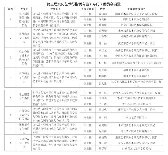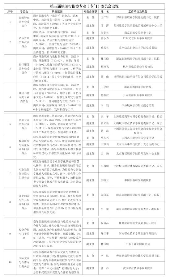 全國文化藝術職業教育教學指導委員會(簡稱“文化藝術行指委”)和全國旅游職業教育教學指導委員會(簡稱“旅游行指委”)是受教育部委托,由文化和旅游部牽頭組建的指導全國文化藝術職業教育和旅游職業教育的專家組織。按照行指委有關工作章程,現將第三屆文化藝術行指委和第三屆旅游行指委下設專業(專門)委員會設置公告如下: