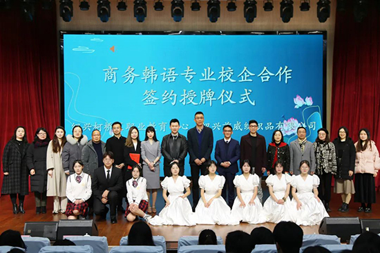 2月23日,紹興市柯橋區職業教育中心、紹興首威紡織品有限公司校企合作簽約儀式在學校報告廳舉行。紹興首威紡織品有限公司總經理、輕紡城海促會韓國分會長于增范,浙江師范大學學前教育學院副教授張自在,輕紡城海促會韓聯辦主任孔君華,人事經理蔡卓妤,柯橋區教育體育局職成教科科長王決芳,柯橋區職業教育中心校長鐘建康、副校長沈春紅以及相關處室負責人,各韓語班班主任、學生一同參加活動。
