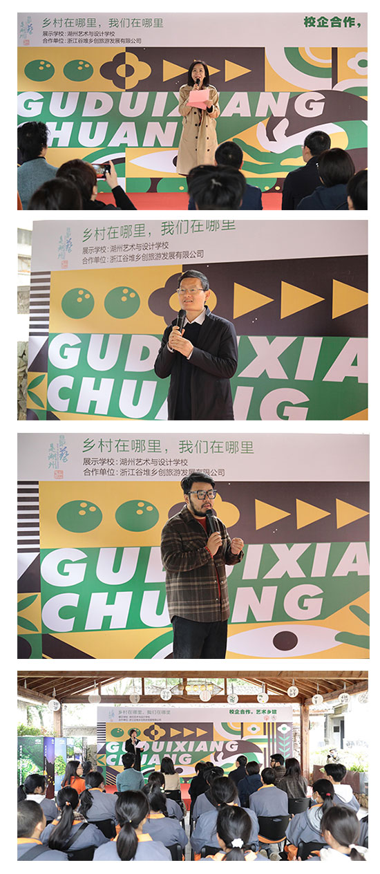 出席此次開幕式的領導和嘉賓有:吳興區宣傳常務副部長宋振強,吳興區委宣傳部部委會議成員——文聯副主席張寅,湖州文學院/書畫院院長陸麗萍,吳興區妙西鎮人大主席吳仁斌,浙江谷堆鄉創旅游發展有限公司總經理蔣曉鋒,湖州藝術與設計學校校長方毅瑛,副校長武紅。學校相關部門負責人、工藝美術專業教師和學生一同參加開幕式。