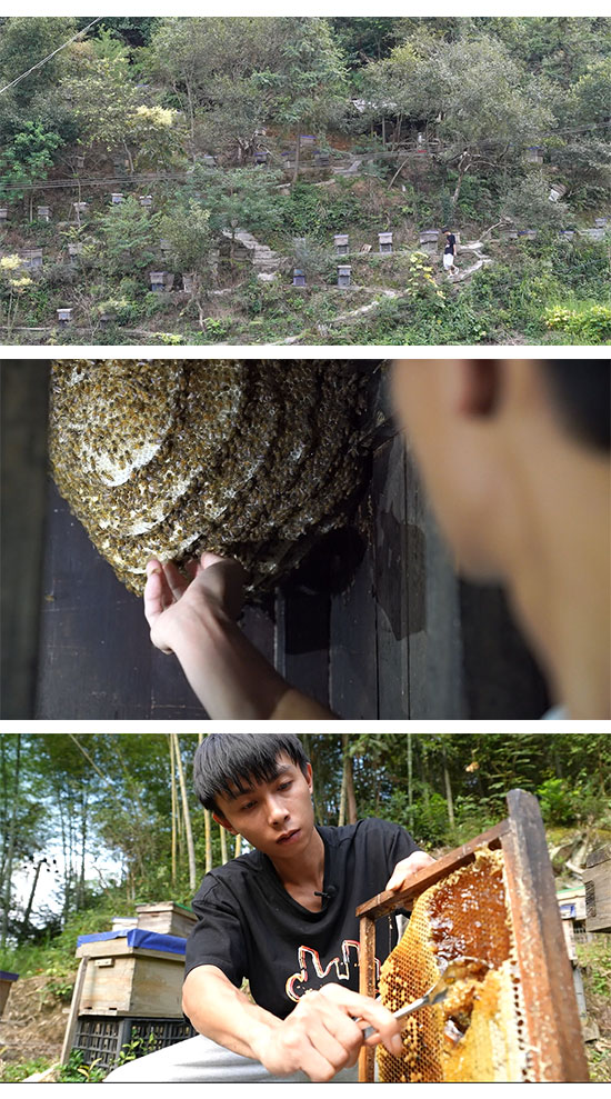 經過9年的時間,從最初的10箱蜜蜂養殖規模,成功擴增到今天的1365箱,已經擺滿內坑湖自然村的各個山頭,今年預計產值可達四百萬元。
