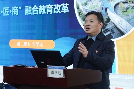 隨后,學校校長雷學遠做《基于“新混合所有制”的“禮·匠·商”融合教育改革》主題講座。他以新《職教法》為背景,聚焦中職教育的機制、平臺、目標三大問題,分享我校的主要做法和經(jīng)驗啟示。