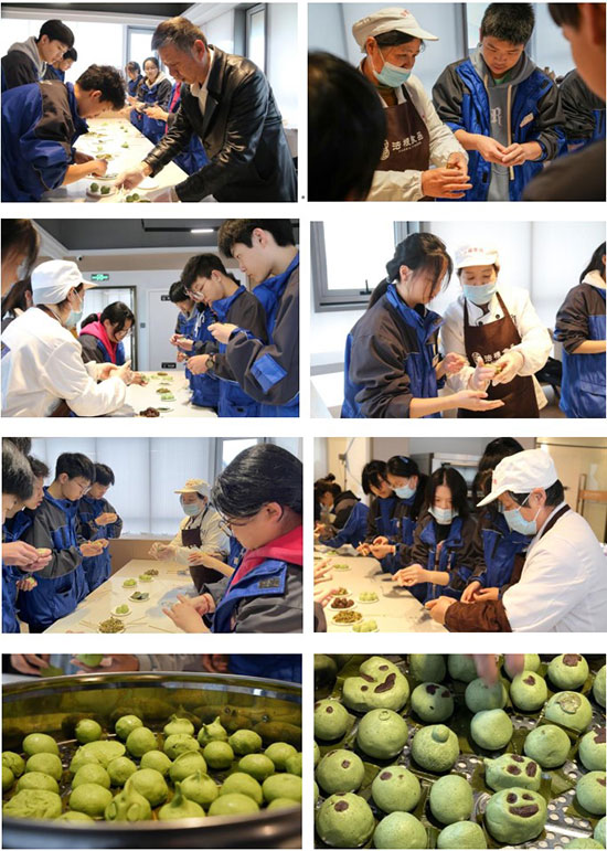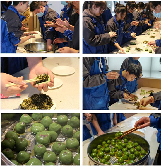 在法根老板和阿姨們的指導與幫助下,同學們漸漸掌握技巧,熟練完成青團制作,并開始了自己獨具風格的創作。傳統美食與現代造型的融合,也是將傳統飲食文化進行了傳承。