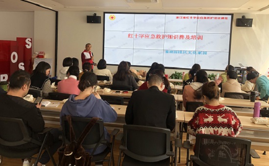 培訓邀請柯橋街道紅十字培訓基地負責人薛紅建授課,薛紅建以理論和現場操作相結合的方式,講解了“紅十字運動知識與現場心肺復蘇及應急救護概念”“氣道異物梗阻與急性冠狀動脈綜合癥的處置方法”,并演示了“意外傷害(淹溺、中暑、動物咬傷、蚊蟲蟄傷、交通事故等)的處理及創傷救護包扎方法”“AED的正確使用知識”等的操作流程和技術要領。薛紅建說:“組織紅十字應急救護普及培訓,旨在傳播紅十字‘人道、博愛、奉獻’精神,弘揚紅十字“三救三獻”內容,堅持“人道、公正、中立、獨立、志愿服務、統一、普遍”紅十字七項原則。