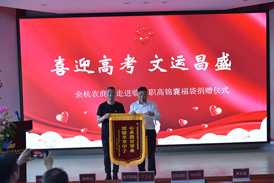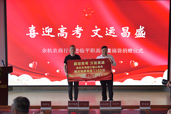 近日,余杭農商行走進杭州市臨平職業高級中學,向臨職高三學子贈送“喜迎高考 文運昌盛”錦囊福袋,共1140份,福袋內裝著透明水杯、”文運昌盛”印章、考試通關卡、紅色T恤、文具袋、定勝糕等物品,這些物品飽含著余杭農商行對臨平職高學子的滿滿祝福!
