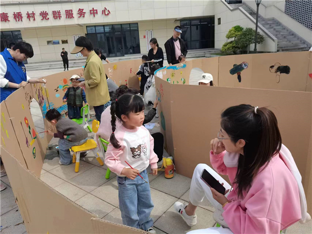 活動(dòng)前,社區(qū)志愿者和社工為孩子們準(zhǔn)備了顏料和畫(huà)筆,還在操場(chǎng)上用瓦楞紙圍成一個(gè)大大的蝸牛圈。孩子們拿到工具后都躍躍欲試,在蝸牛圈里選擇一塊“畫(huà)布”,迫不及待地和媽媽、爸爸用自己的畫(huà)筆進(jìn)行布局和構(gòu)圖,慢慢地,小草、鮮花、小鳥(niǎo)、太陽(yáng)彩虹等等,經(jīng)過(guò)孩子們極具創(chuàng)意的描繪和上色后變得栩栩如生。天真可愛(ài)的孩子們運(yùn)用美術(shù)元素,用線(xiàn)條和色彩勾勒出自己心中對(duì)藍(lán)天綠樹(shù)、紅花青草的渴望,表達(dá)了自己對(duì)多彩春天的熱愛(ài)與祝福。