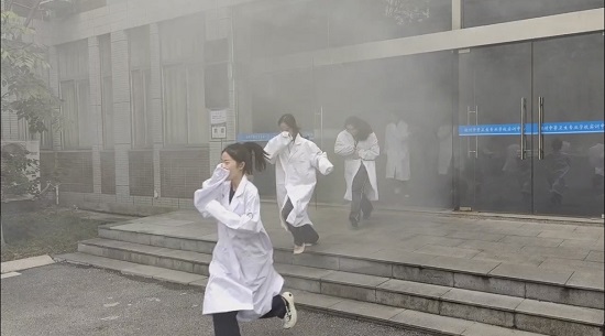 上午9時,實訓樓各個通道的煙霧逐漸彌漫開來,隨著一陣急促的哨聲響起,消防演練正式開始。在實訓樓授課的教師們帶領學生根據(jù)演練方案中規(guī)定的路線,沿著學校指定樓梯口快速疏散,有序撤離到學校操場的安全地帶。此次演練共用時2分40秒,整個過程緊張有序,達到了預期的效果。