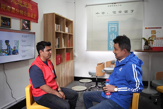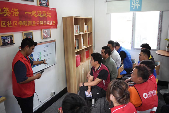 來自尼泊爾的上城區(qū)社區(qū)好老師Pujan(普揚(yáng))帶領(lǐng)小哥們學(xué)習(xí)英語,將英語與日常問候、工作對話結(jié)合,以純正的發(fā)音、幽默的語言、生動(dòng)的表情以及靈活的教學(xué)方法,教授大家普通、實(shí)用的英語口語交流。聆聽著純正的英語發(fā)音,感受著英語的無限魅力,小哥們更表現(xiàn)出對外語學(xué)習(xí)的極大興趣和信心。