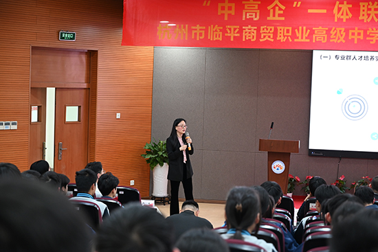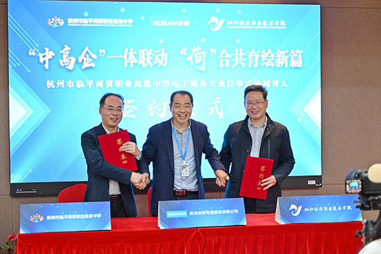 為加快推進現代職業教育體系建設,深化臨平商貿職業高級中學產教融合,促進教育鏈、人才鏈與產業鏈、創新鏈有效銜接,4月26日下午,由臨平區教育局主辦、臨平區校地辦與杭州市臨平商貿職業高級中學共同承辦的“中高企”一體化電子商務專業訂單式協同育人簽約儀式順利舉行。浙江經濟職業技術學院商貿流通學院院長汪永華、副院長方文英,杭州老板電器股份有限公司黨委副書記唐根泉,臨平區教育局調研員周順芳,臨平區商務局黨委委員、副局長錢江,臨平區校地辦負責人沈金燕,臨平區商務局電子商務科科長郭帥,臨平區教育局基礎教育科副校級視導員沈美華,杭州市臨平商貿職業高級中學校長朱慧明、黨委書記邵曉舟、副校長張光升及師生代表共同出席儀式,儀式由學校副校長查文婷主持。