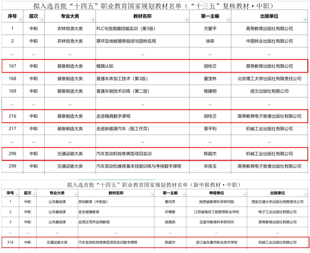 近日,教育部發布《關于擬入選首批“十四五”職業教育國家規劃教材名單的公示》。經有關單位申報、形式審查、專項審核、網絡和會議評審、專家復核等程序,永康職技校有4本教材成功入選。包括胡桂蘭老師主編《模具認知》《走進模具數字課程》兩本教材,陳超杰老師主編《汽車發動機檢修典型實訓項目》《汽車發動機檢修典型實訓項目數字課程》兩本教材。
