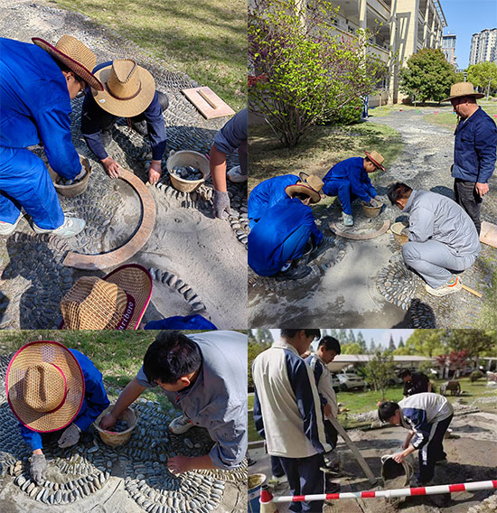 隨著中小學勞動教育的普及,越來越多的中小學開設了勞動教育課程。寧波建設工程學校建筑專業每星期都有四節實訓課,每學期的實訓項目也各不相同。尤其是高二,采取小班化的教學形式,分成三個實訓項目,每個項目15人左右,通過漸進循環式的教學模式,提升學生的技能水平。這次維修鵝卵石路的任務,是學生技能從模擬實訓到實戰演練的轉變。建筑學部部長盛家敏說:“如果說學生在實訓課中很好地鍛煉了動手能力,培養了他們的勞動意識,那么這次維修鵝卵石路則更好地體現了勞動教育的內涵——在出力流汗中成長,感受勞動的艱辛。”