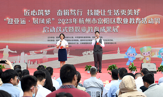為貫徹落實新修訂的《中華人民共和國職業(yè)教育法》和中辦、國辦《關于深化現代職業(yè)教育體系建設改革的意見》精神,按照教育部、省教育廳、市教育局關于職業(yè)教育活動周的工作部署,大力弘揚勞動光榮、技能寶貴、創(chuàng)造偉大的時代風尚,展示富陽區(qū)職業(yè)教育改革發(fā)展成果,進一步營造良好的社會氛圍,5月14日,富陽區(qū)職業(yè)教育中心成功承辦以“匠心筑夢 奮楫篤行 技能讓生活更美好”為主題的2023年杭州市富陽區(qū)職業(yè)教育活動周啟動儀式暨職業(yè)教育成果展。杭州市教育局職成教處處長宋小華,杭州市教育發(fā)展服務中心副書記、副主任高志剛,富陽區(qū)委常委、宣傳部部長張鵬,區(qū)人民政府副區(qū)長黃澤,區(qū)政府辦、區(qū)委宣傳部、區(qū)教育局、區(qū)人力社保局、區(qū)經信局、區(qū)農業(yè)農村局、區(qū)財政局、區(qū)總工會、團區(qū)委分管領導,中職學校(含技工院校)、初中學校校長,企業(yè)代表,市民代表,師生代表參加此次活動。