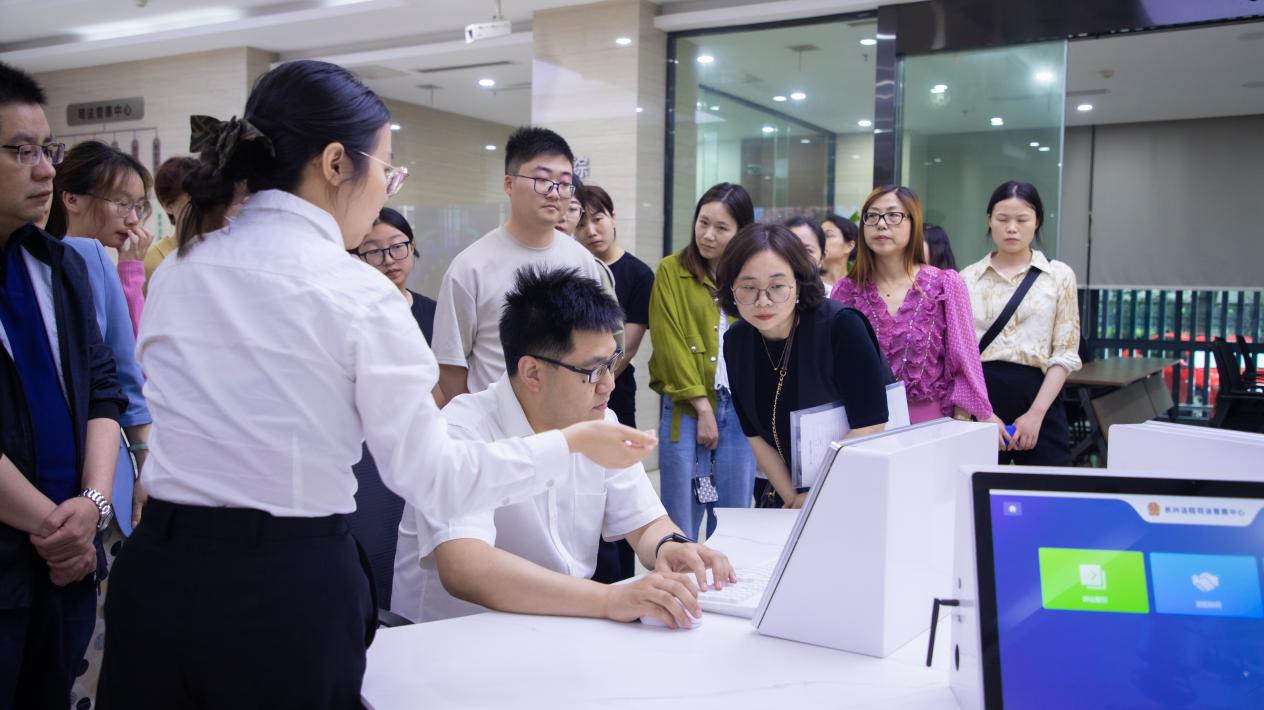 長興人民法院司法普惠中心工作人員向大家介紹了司法普惠中心的發展歷程,并帶領參觀了訴訟指引區、在線協同區、在線訴訟區、法治體驗區、惠民服務區和綜合指揮室“五區一室”。特別是人機交互的導訴模式、“自助畫像交互終端機器”引起了大家的關注,大家紛紛參與體驗,一行人還參觀調解長廊,觀看各類典型案例;并走入審判庭,感受了法庭的莊嚴和神圣。