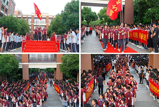 在校長的帶領下,全體高三同學激情高唱國歌,并嘹亮地喊出“高三加油,高考必勝”的戰斗口號和莊重誓言!20服化班時文慧同學作為學生代表,從孫良杰校長手中接過“必勝之師”的大旗,隨后帶領高三隊伍向著“狀元橋”進發。在“必勝之師”隊伍有序通過“狀元橋”之時,本次活動的高潮出現了——高一高二的2000多名同學,列隊出現在教學樓和道路的兩旁,他們手持“為夢想努力,做校園傳奇”“堅持到底,成功有你”的橫幅為學長、學姐加油,也有的拉出“今年看你的,明年看我的”的橫幅,表明向高三學子學習看齊的志向。“高三加油,高考必勝!”數千人的加油吶喊聲在整個校園中回蕩,高三的同學在學弟學妹的加油聲中熱淚盈眶,也堅定了“繼續前進,激情拼搏,誓取勝利”的決心!