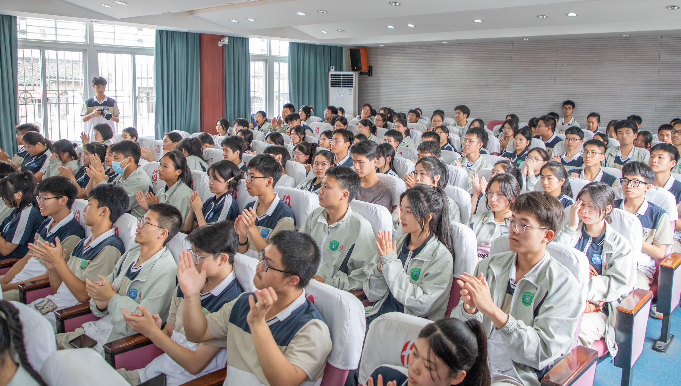 溫州市第二職業(yè)中等專業(yè)學校特邀攝影大師黃信樂、美發(fā)大師林冠雄、全國勞動模范曹輝、國家一級導演章世杰以及溫州市勞動模范徐亮五位杰出的甌匠名家為全校師生作講座。