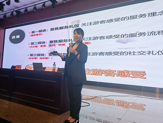 簡短的開幕式后,進行了緊鑼密鼓的培訓。國家級金牌導游、杭州科技職業(yè)技術(shù)學院研學旅行管理與服務(wù)專業(yè)負責人余云建講師以“從亞運‘江南憶’看杭州三‘世遺’”為主題,進行富陽鄉(xiāng)村旅游講解技巧的傳授。杭州科技職業(yè)技術(shù)學院朱永文副教授則緊密聯(lián)系富陽區(qū)旅游景點與文化,深入淺出地講解“如何創(chuàng)作導游詞”。金牌導游卓越培訓師、浙江旅游職業(yè)學院旅行服務(wù)與管理學院韓德瓊講師利用自己豐富的工作經(jīng)歷,通過一個個典型案例,給學員們分析比賽中出現(xiàn)的問題和困惑,進行導游比賽賽前職業(yè)技能指導。高級禮儀師、杭州科技職業(yè)技術(shù)學院馬雁飛講師給學員們帶來了《亞運有禮》,從導游服務(wù)接待禮儀、儀容儀表等方面做深入精彩的指導。富陽區(qū)職業(yè)教育中心高級講師許燕華帶領(lǐng)學員學習“亞運英語”,以飽滿的熱情進行口語練習,掀起學英語的熱潮。