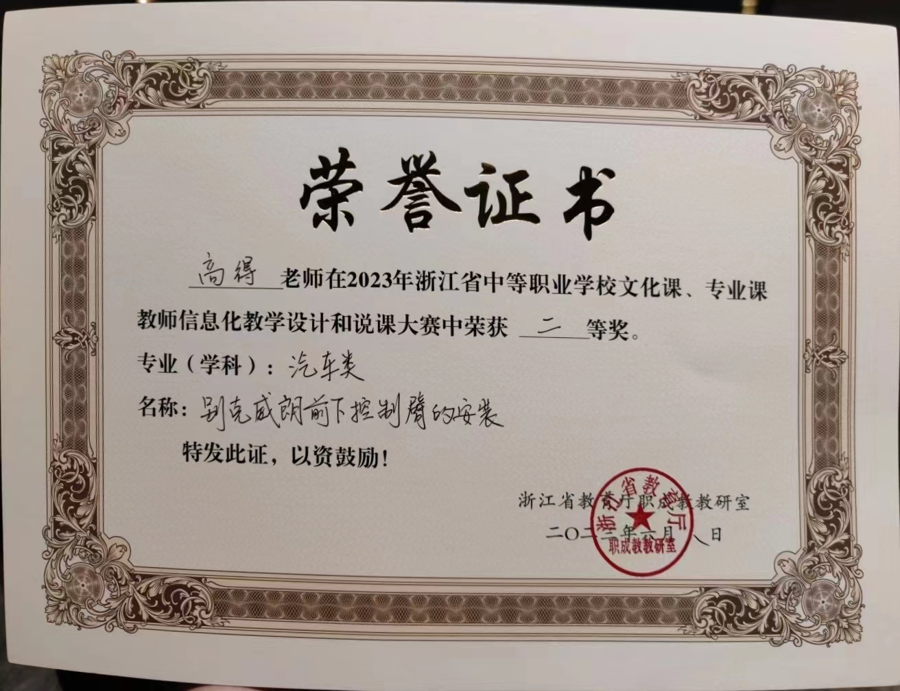 在2023年浙江省中等職業(yè)學(xué)校文化課、專業(yè)課教師信息化教學(xué)設(shè)計和說課大賽汽車類賽項中,蒼南縣職業(yè)中等專業(yè)學(xué)校交通旅游學(xué)部何駿杰老師斬獲一等獎,高得老師榮獲二等獎。