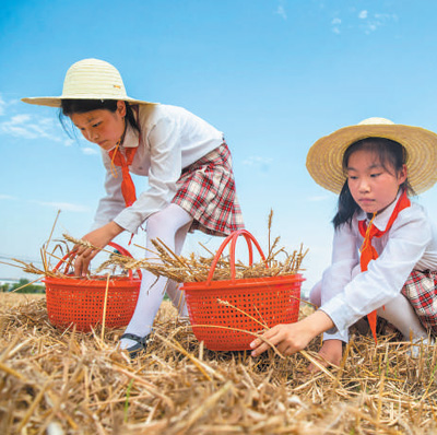 江蘇省海安高新區(qū)實驗小學(xué)開展“熱愛勞動 珍惜糧食”教育活動,少先隊員在麥田里撿拾散落的麥穗。