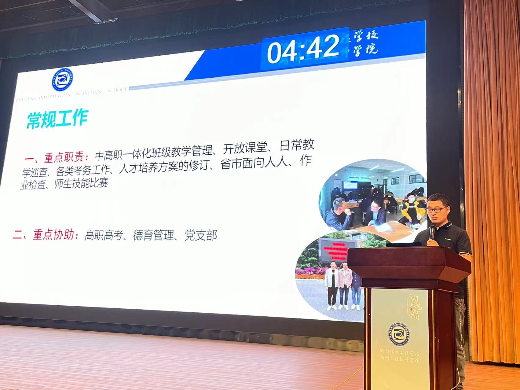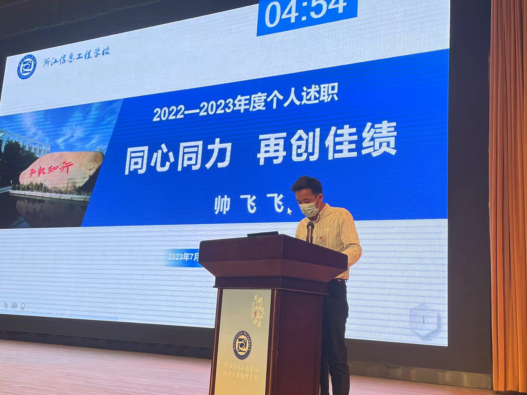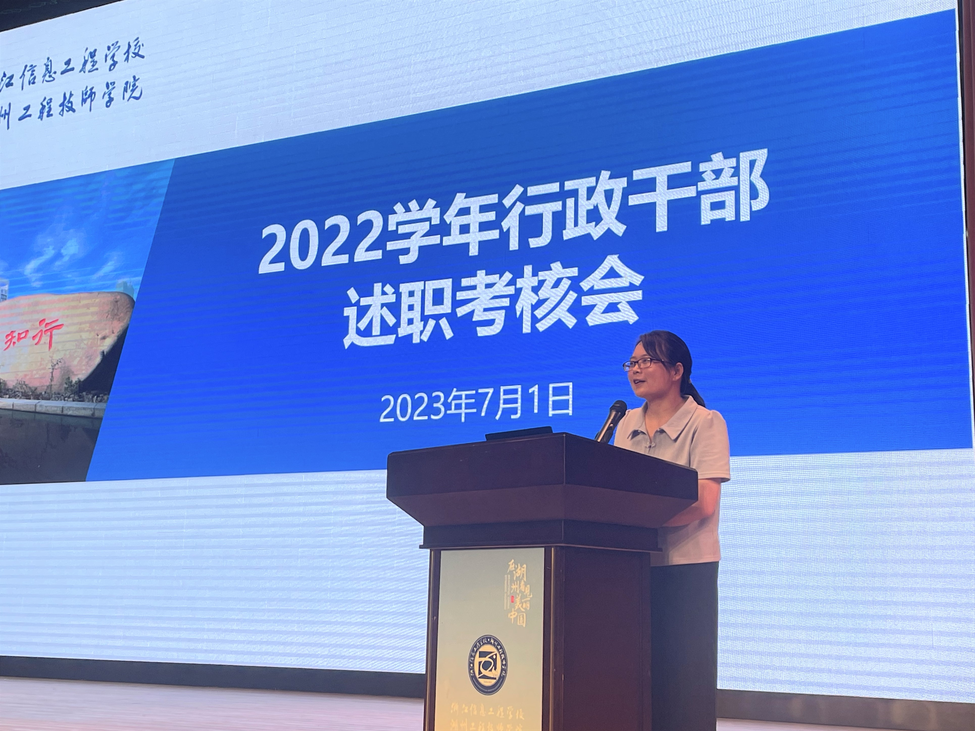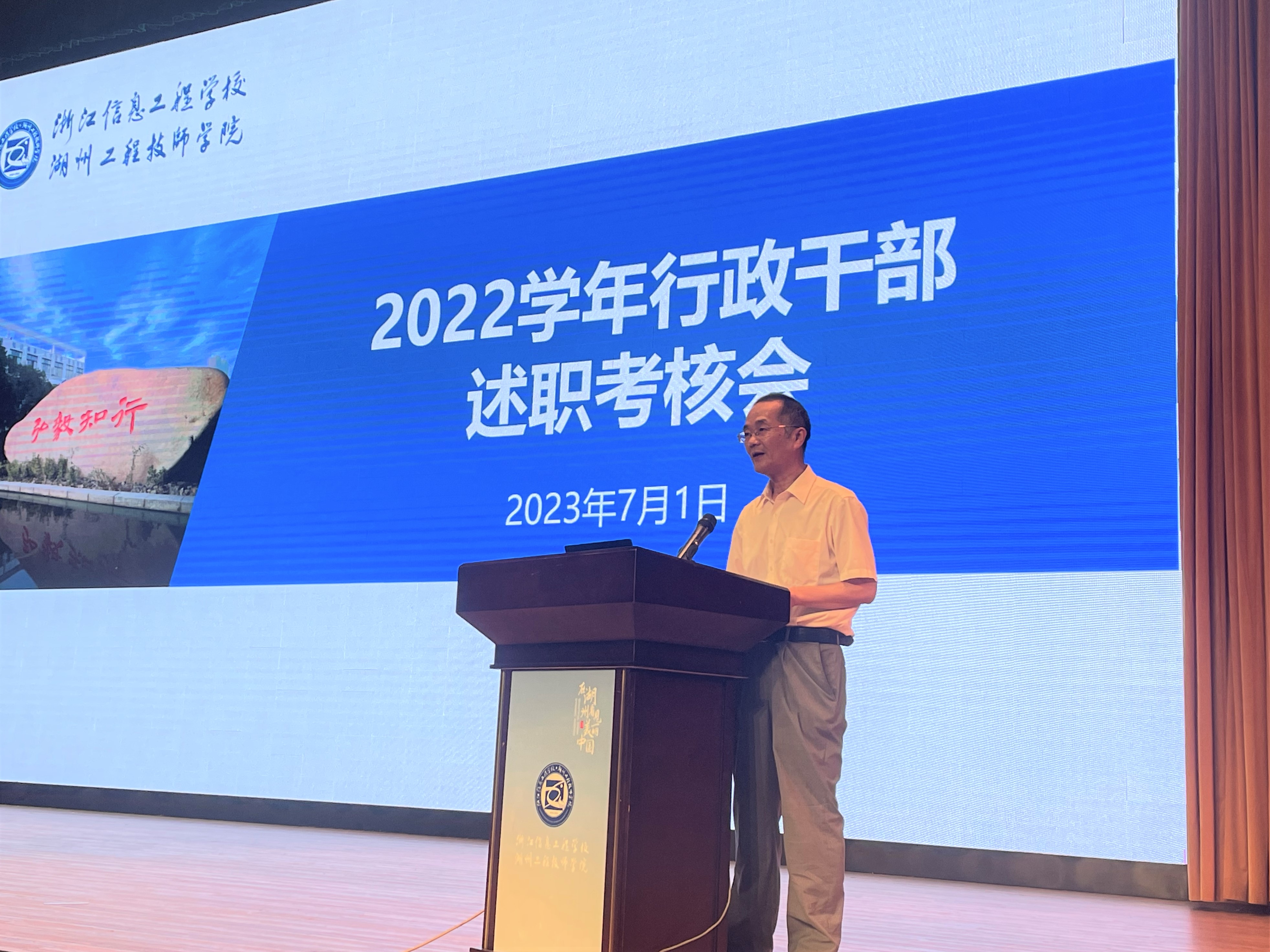 為切實加強各處室、專業(yè)部干部隊伍建設(shè),進一步激勵提升廣大干部履職盡責、干事創(chuàng)新的積極性,促進全校教職工對行政干部工作的理解及支持,7月1日下午,浙江信息工程學(xué)校·湖州工程技師學(xué)院在校大會堂召開2022學(xué)年行政干部述職考核會。會議由副校長湯方榮主持。湖州市教育局職成教處副處長馬玲玲、浙江省湖州藝術(shù)與設(shè)計學(xué)校黨委書記唐海佺及學(xué)校專業(yè)部五位教師代表應(yīng)邀擔任評委,學(xué)校全體教職工參加會議。