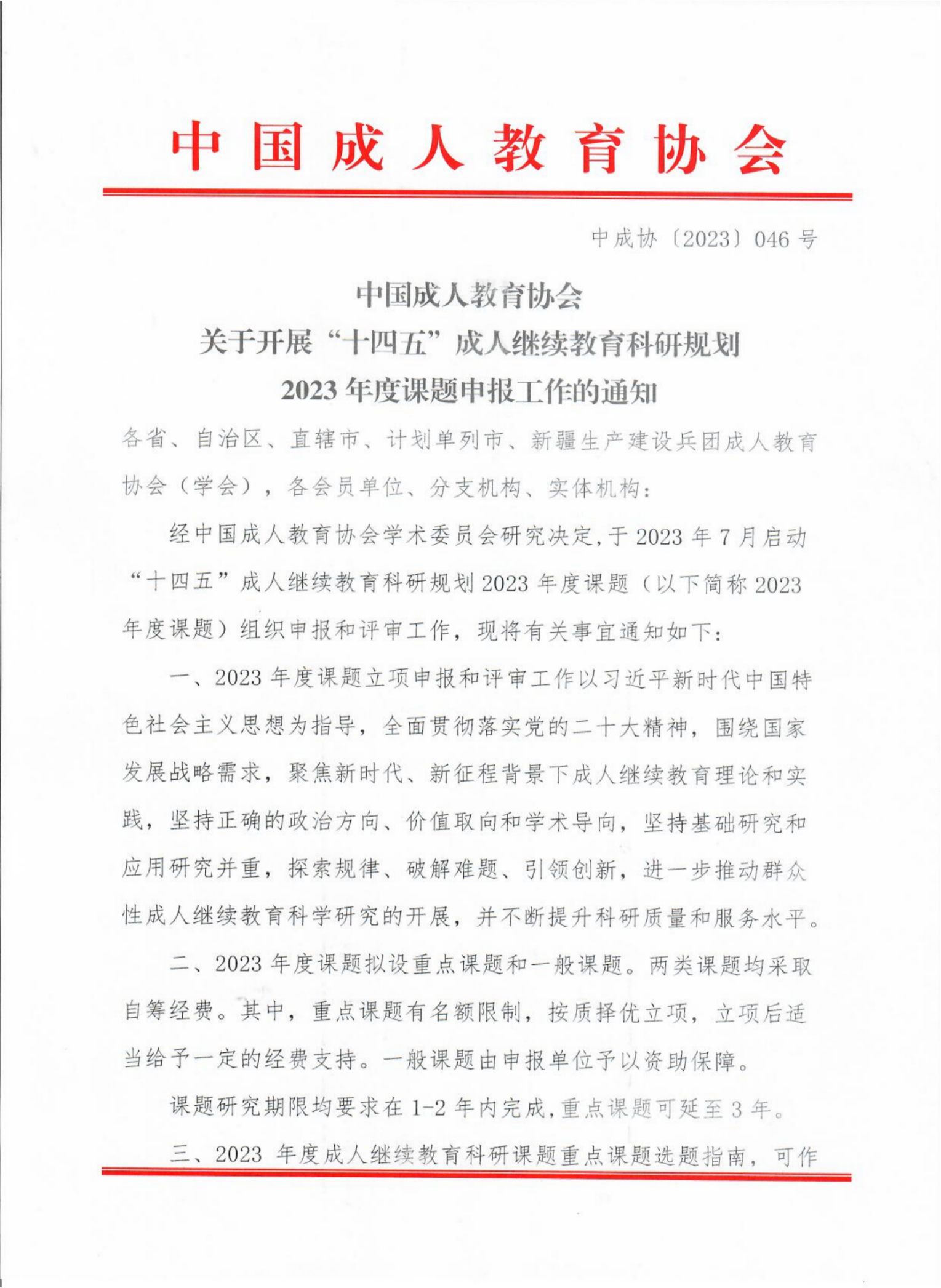 附件:《中國成人教育協(xié)會關(guān)于開展“十四五”成人繼續(xù)教育科研規(guī)劃2023年度課題申報(bào)工作的通知》(中成協(xié)[2023]046號)