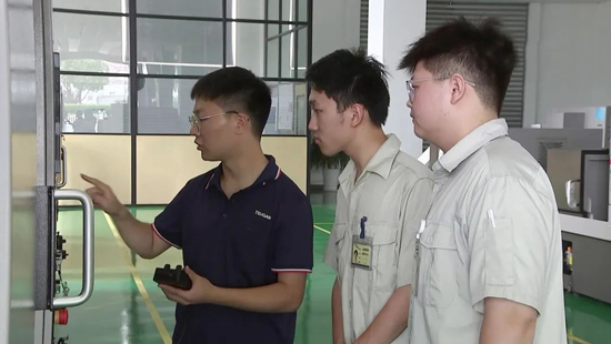 津上精密“雙元制”訂單班的學生,入學前兩年在學校學習理論知識,之后兩年一半時間到津上精密,由企業(yè)導師手把手進行實操指導,等到第五年,學生們積累了足夠的理論和實踐經驗,就開始進駐車間,獨立完成整套產品流程。