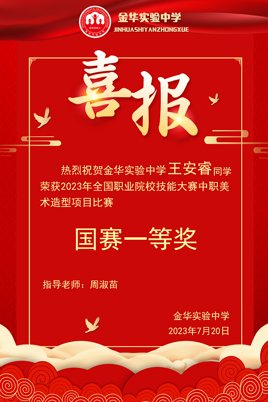 7月20日,金華實驗中學工美2101班王安睿同學榮獲2023年全國職業院校技能大賽中職美術造型項目比賽一等獎,這是該校學生在全國技能大賽上的新突破。