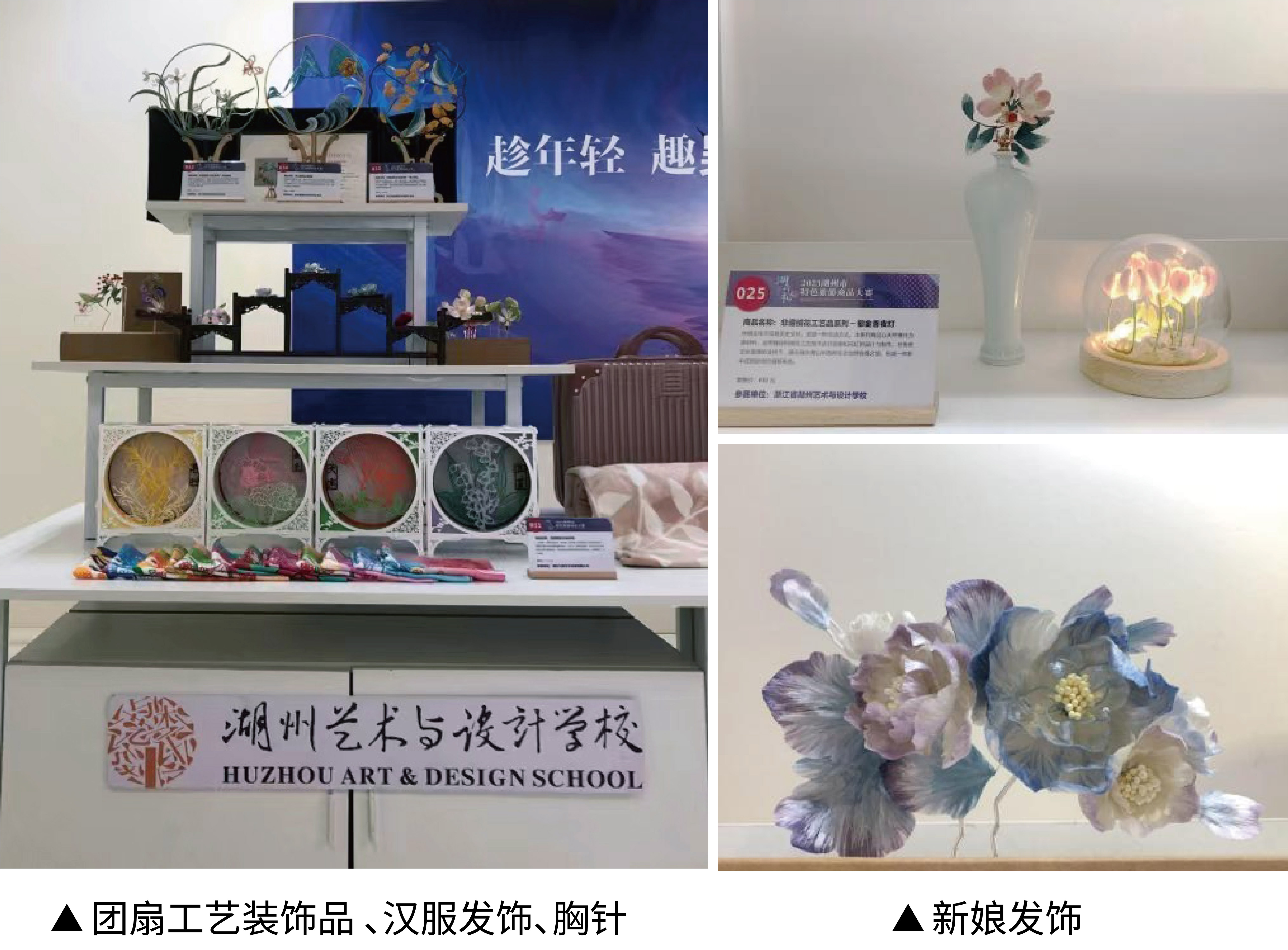 展出作品主要由“木棉文創(chuàng)”工作室指導(dǎo)老師張冰筠帶著學(xué)生共同創(chuàng)作,集非遺絨花文創(chuàng)工藝裝飾與生活時(shí)尚文創(chuàng)于一體。以“綠水青山中各種自然生態(tài)怡然自得之境”為主題,用天然蠶絲為原材料,運(yùn)用纏花和絨花非遺工藝技術(shù)設(shè)計(jì)并制作成團(tuán)扇工藝裝飾品、漢服和新娘發(fā)飾、胸針、夜燈等。同時(shí)結(jié)合微信商城平臺(tái),在現(xiàn)場(chǎng)展示出售渠道、包裝設(shè)計(jì)。