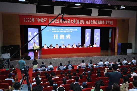 8月19日,2023年“中銀杯”全國職業(yè)院校技能大賽高職組幼兒教育技能賽項(xiàng)學(xué)生賽在金華職業(yè)技術(shù)學(xué)院隆重開幕。金華市副市長莊凌飛,浙江省教育廳職成教處二級調(diào)研員祝鴻平,天津現(xiàn)代職業(yè)技術(shù)學(xué)院原黨委書記李國楨,中國銀行金華市分行副行長陳劍,幼樂美(北京)教育科技有限公司總經(jīng)理田久民,金華職業(yè)技術(shù)學(xué)院院長梁克東、總督學(xué)成軍,賽項(xiàng)專家組長、裁判長、監(jiān)督仲裁長、特邀嘉賓,各省、自治區(qū)、直轄市和新疆生產(chǎn)建設(shè)兵團(tuán)的領(lǐng)隊(duì)、指導(dǎo)老師、參賽選手等300余人出席開賽式。梁克東、祝鴻平先后為大賽致辭,莊凌飛宣布開賽。開賽式由金職院副院長張雁平主持。