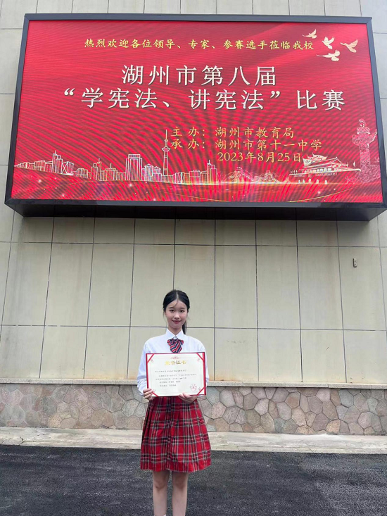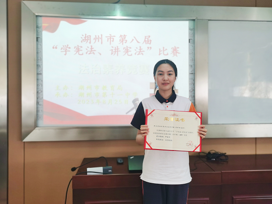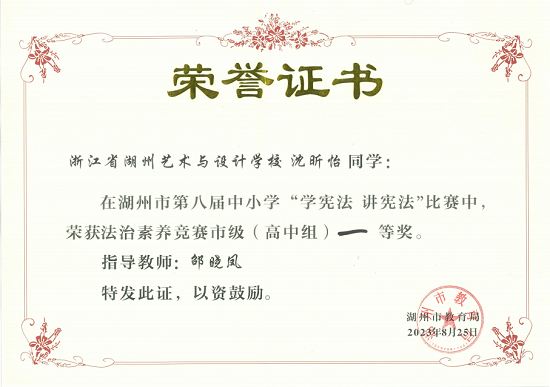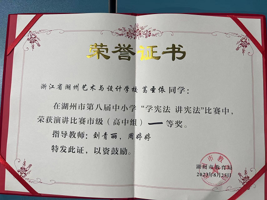 8月25日,由湖州市教育局主辦的2023年第八屆“學(xué)憲法 講憲法”比賽在湖州十一中舉行。浙江省湖州藝術(shù)與設(shè)計(jì)學(xué)校2104班葛圣依同學(xué)在演講比賽取得一等獎(jiǎng)第一名的好成績(jī),2204班沈昕怡同學(xué)在法制素養(yǎng)競(jìng)賽中榮獲高中組一等獎(jiǎng)。