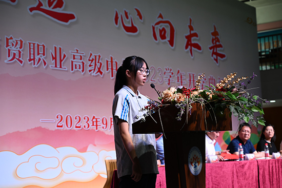 電商232班林艷同學發言。林艷同學品學兼優,今年以優異的成績考入學校電商實驗班就讀。高一新生帶著父母的叮嚀、長輩的關懷,懷揣著對新學期的憧憬,元氣滿滿地開啟人生中新一輪的挑戰。