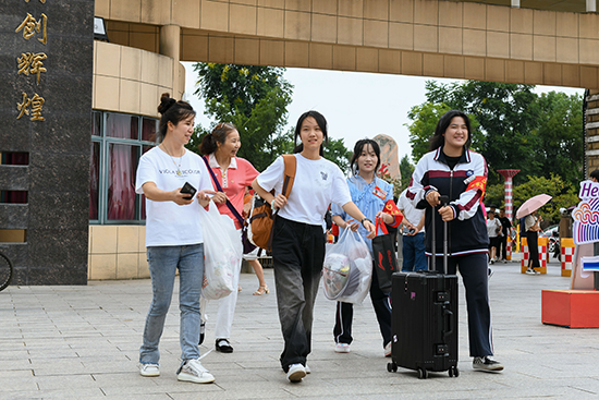 “你好,我們是志愿者,我帶你去報到場地”“新生,你好,行李我幫你拿”“你好,同學,我帶你去匠心樓領取生活用品和校服”“同學,你好,我帶你去寢室,請往那邊走”……