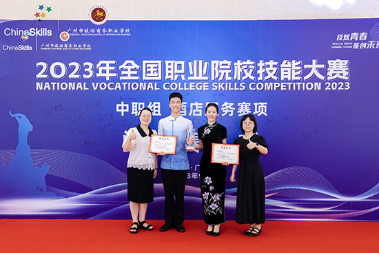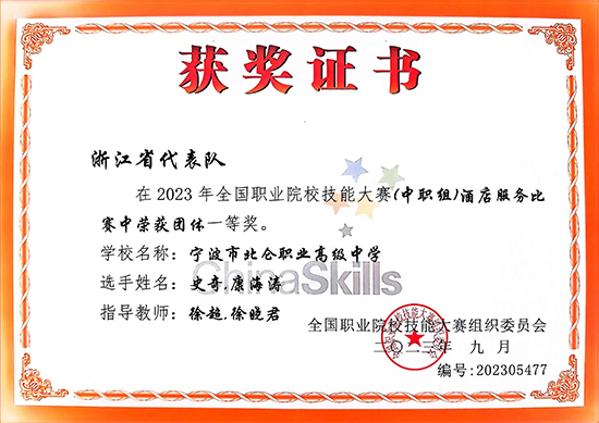 8月30日至9月4日,2023年全國職業院校技能大賽(中職組)酒店服務綜合賽項在廣州白云國際會議中心隆重開賽。寧波市北侖職業高級中學的史奇、康海濤兩位同學代表寧波市參加比賽,與來自30個省(區、市)和新疆生產建設兵團的79所職業學校的150余名選手同臺競技。經過激烈角逐,史奇、康海濤憑借過硬的基本功,嫻熟的技能,在比賽中大放異彩,獲得大賽一等獎的佳績。這是北侖職高今年獲得的第3枚國賽獎牌,也是學校標志性成果的再次重大突破!