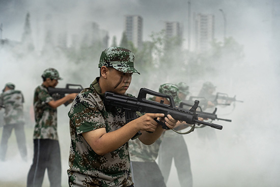 戰(zhàn)術(shù)方陣為大家展示單兵戰(zhàn)術(shù)動作。現(xiàn)場硝煙四起,營造了真實的戰(zhàn)場體驗,“探索前進”“變換陣型”“全體警戒”……隊員們聽從命令,時而持槍前進,時而收攏防御,一招一式盡顯軍人風采。