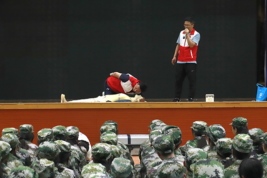 紅十字救護員老師們向同學們介紹了心搏驟停的表現,如何判斷是否喪失意識、有無自主呼吸、有無脈搏,幫助大家判斷應急救護的正確時機,并通過“模擬人”示范胸外按壓、清理口腔異物、開放氣道、人工呼吸等操作要領。講解示范后,學生代表上臺進行現場模擬救護的實操練習,老師們對同學們的操作手法進行了規范指導。