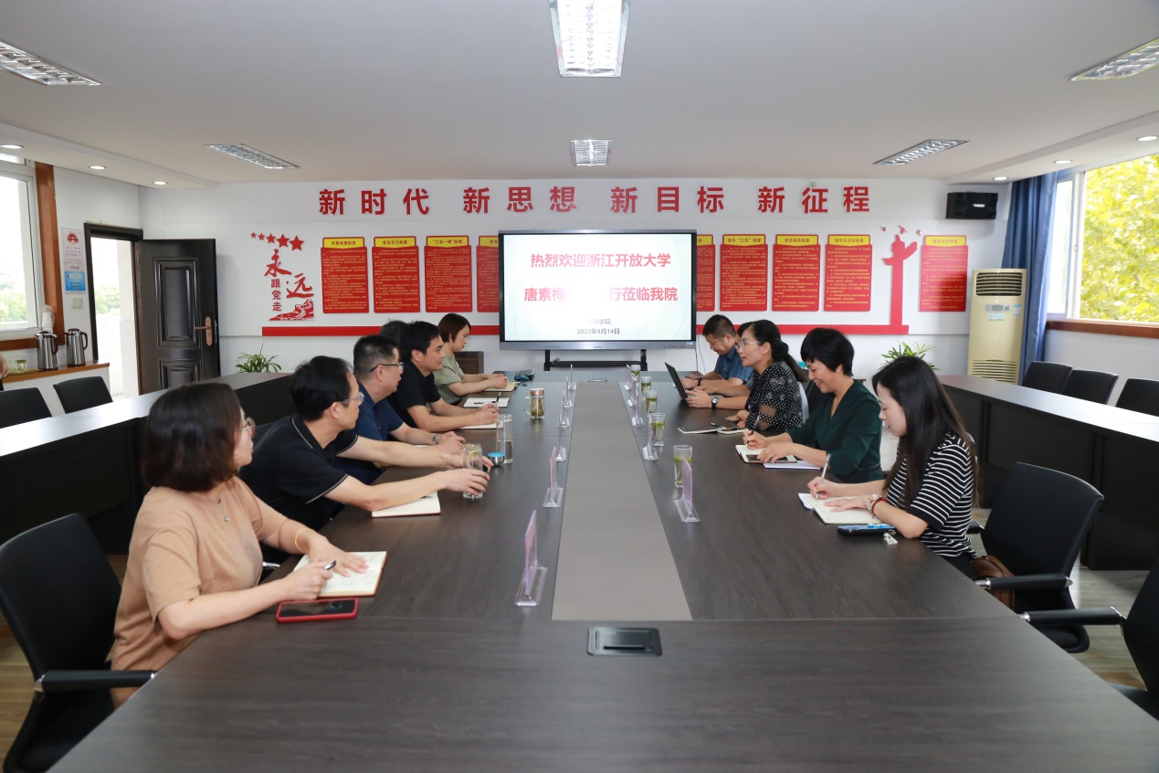 9月14日上午,浙江開放大學黨委委員、紀委書記唐素梅,紀檢監(jiān)察室主任丁紅霞,信息化中心主任張翼翔一行來浙江開放大學長興學院調研,重點了解開放大學綜合改革推進情況、2023年秋季招生工作情況。湖州開大繼續(xù)教育學院副院長雷術海,繼續(xù)教育學院辦公室主任張金靜,長興學院院長章小杰,黨總支書記金曙,副書記孫甫永,副院長周金金,黨總支委員、教務處主任駱秀芳等參與調研并進行座談交流。