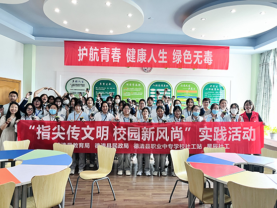 為宣傳與促進學生精神文明建設,提高學生道德素質和公共參與核心素養,9月11日上午,在德清縣教育局和民政局的大力支持下,德清職業中專心理輔導中心和學校社工站合作開展“指尖傳文明 校園新風尚”實踐活動。本次活動由星辰社工徐玉和徐甜來校組織帶領22服裝3+2班同學開展,由專職心理老師崔明敏主持,王美麗老師和談瑩老師共同參與。