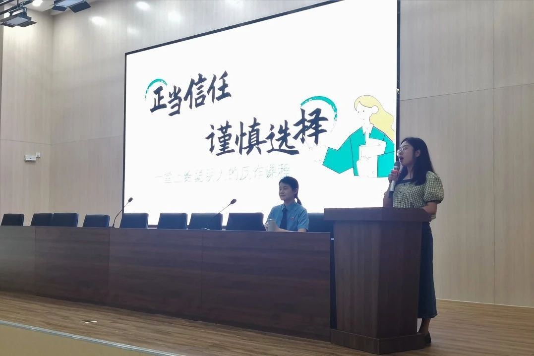 李檢察官為學校師生作《正當信任,謹慎選擇》的反詐騙專題講座,講座圍繞電信詐騙的概念、常見詐騙手段和如何應對等方面展開。她通過近期反詐熱片《孤注一擲》引出“詐騙工廠”這一概念,并結合視頻及大量真實案例,用通俗易懂的語言向同學們闡述電信詐騙的新形式和新手段,著重對“冒充熟人”“網絡刷單”“冒充公檢法等機關詐騙”等詐騙手段進行深度剖析。最后,李檢察官與大家分享了反詐熱線,并通過與學生互動的方式,提醒大家牢記“反詐十個凡是”,嚴守個人信息安全,防范電信網絡詐騙。