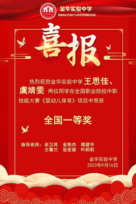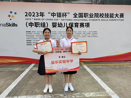 9月13日至16日,由教育部主辦的全國職業院校技能大賽中職學前教育(嬰幼兒保育)項目比賽在北京舉行,金華實驗中學學前專業王思佳、虞婧雯兩位同學代表浙江省出征國賽,憑借扎實的功底、嫻熟的技能和出色的表現,從全國168位選手中脫穎而出,榮獲全國一等獎!