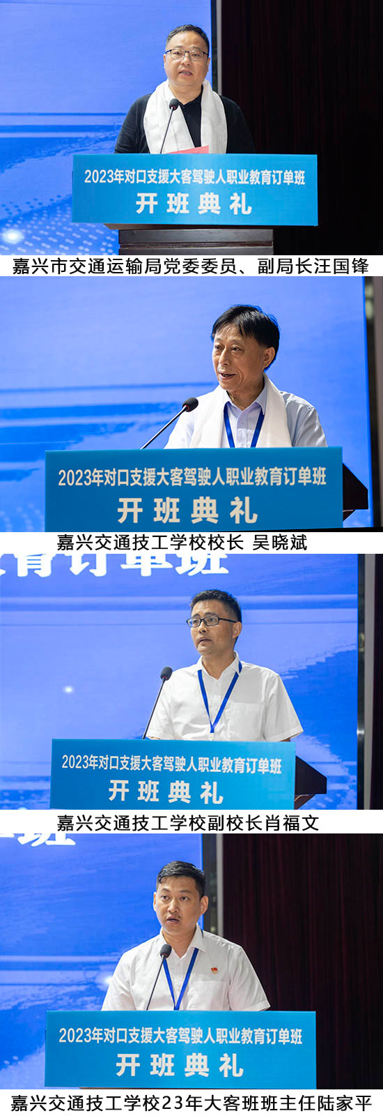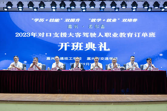 9月15日下午,2023年對口支援大客駕駛人職業教育訂單班開班典禮在嘉興交通技工學校(嘉興市交通學校)舉行,這是嘉興—若爾蓋技能人才定向培養就業合作項目的第二次開班。嘉興市交通運輸局、嘉興市公路運輸與管理中心、嘉興市公安局交警支隊車輛管理所、嘉興市交通投資集團有限責任公司、嘉興市國鴻汽車運輸有限公司、嘉興市公共交通有限公司、平湖市教育局、平湖市人力資源和社會保障局、浙江開放大學平湖學院等單位領導及2023年對口支援大客駕駛人職業教育訂單班全體學生和班主任出席。